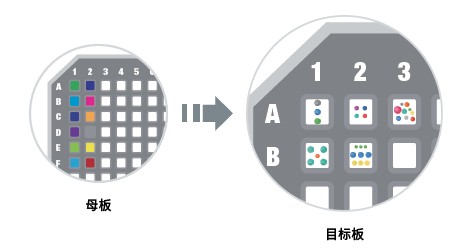 图一:从母板任意孔转移任意体积样品到目标板任意孔中,实现快速挑选、样品混合和组合