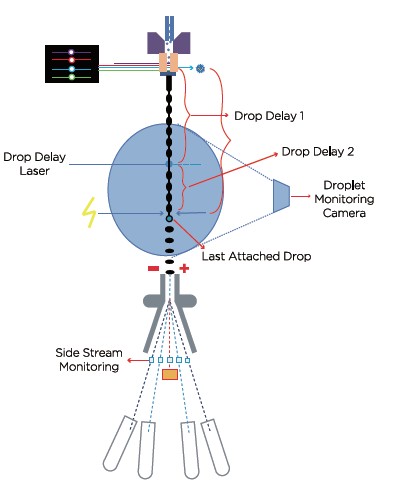 完成液滴校准后,系统自动依次校准每条分选液流的电流相位、电压和偏转度。检测器还使废液流保持垂直。