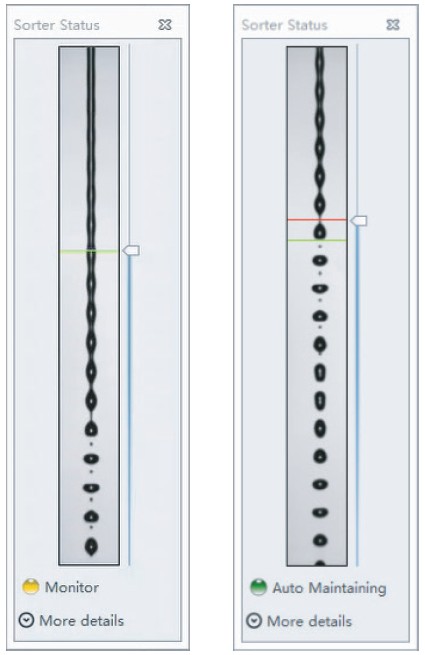 通过分选校准,系统获得最佳液滴断点、最佳侧液流设置并自动生成液滴延迟值(自动液滴延迟)。当软件检测到液流不稳定且在 1 分钟内无法通过自动保持功能恢复,启动自动恢复功能。
